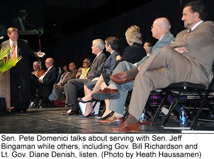 Chuckles and kind words characterized the event at which Sen. Jeff Bingaman, Lt. Gov. Diane Denish and Las Cruces Mayor Ken Miyagishima, all Democrats, also praised the Republican senator’s 36-year tenure — the longest of any