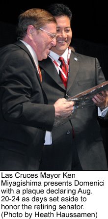 Chuckles and kind words characterized the event at which Sen. Jeff Bingaman, Lt. Gov. Diane Denish and Las Cruces Mayor Ken Miyagishima, all Democrats, also praised the Republican senator’s 36-year tenure — the longest of any