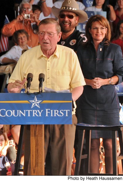 Country singer Hank Williams Jr. warmed up the crowd for Palin by playing several songs and talking about his support for the McCain/Palin ticket. At one point he referred to the Obama candidacy as “bull crap,” and said the American people will see through it.