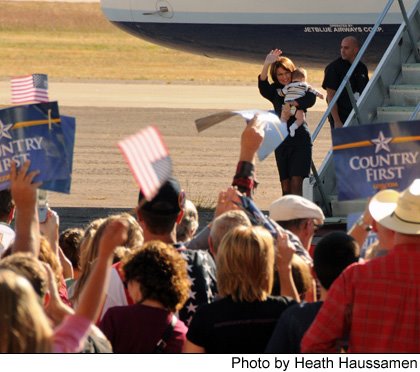 In addition to tax cuts, Palin spoke about energy independence, health care and college education. She also talked about doing more to help children with special needs. When Palin arrived at the event, she walked off the airplane and along a path toward the crowd with her infant son Trig in her arms. Trig has Down syndrome.