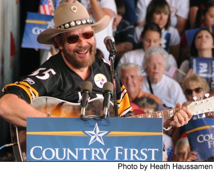 Country singer Hank Williams Jr. warmed up the crowd for Palin by playing several songs and talking about his support for the McCain/Palin ticket. At one point he referred to the Obama candidacy as “bull crap,” and said the American people will see through it.