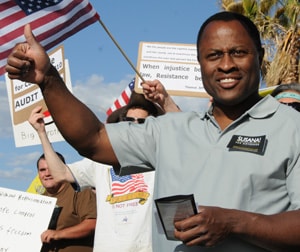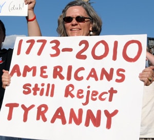 A tax protester from today's event. (Photo by Heath Haussamen)