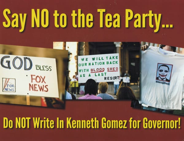 “Say NO to the Tea Party,” the mailer states. “Do NOT Write In Kenneth Gomez for Governor!”