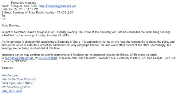 “In light of Secretary Duran’s resignation on Thursday evening, the Office of the Secretary of State has cancelled the rulemaking hearings,” states the 11:18 p.m. Thursday message to unknown recipients. It was obtained and released by the Democratic Party of New Mexico.