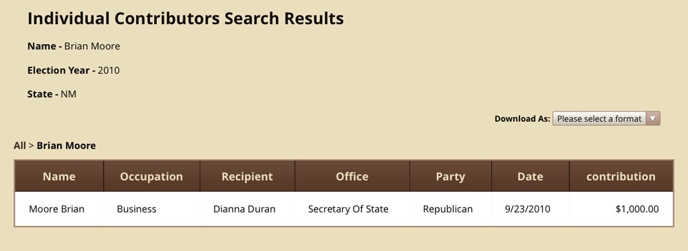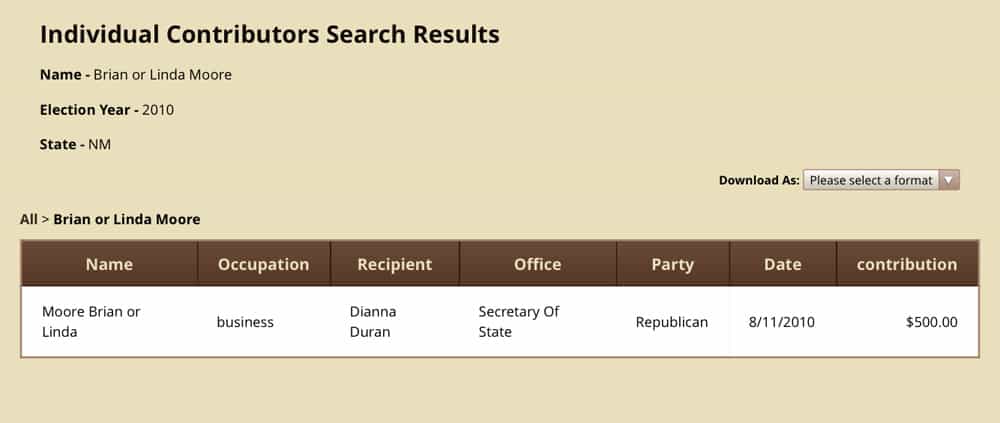 Brian Moore told NMPolitics.net that check was intended “as a campaign donation,” as was a $1,000 donation he made to Duran in September 2010. Both contributions showed up on Duran’s 2010 finance reports (here and here) even though one allegedly ended up in her personal account instead.